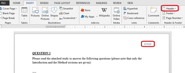 For example: bakirci_deniz_67416 . That 5-digit random number should also appear as a header across all your written pages (see visual below & check https://edu.gcfglobal.org/en/word2016/headers-and-footers/1/ for how to make a header).